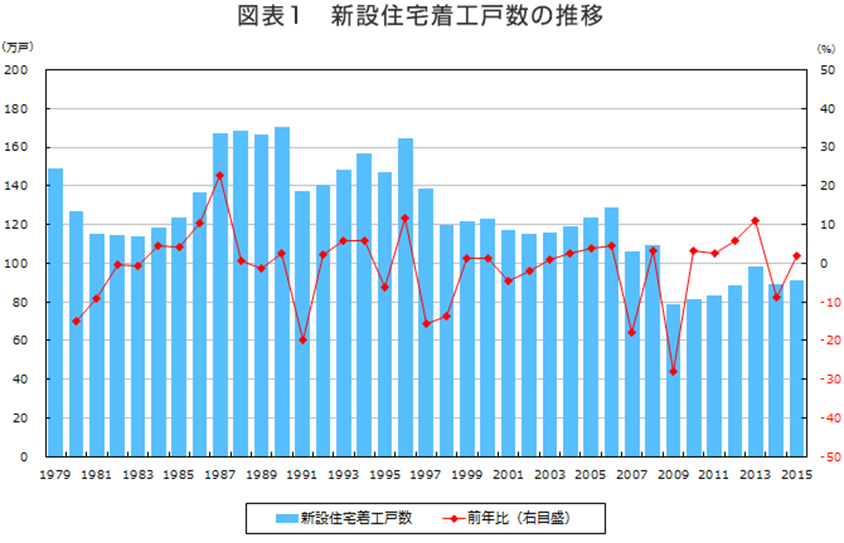 1970年代のことを振り返ると、73年/185万戸をピークに図表1のように83年/115万戸まで一度減じてから、バブル崩壊(90年)に向かって170万戸まで増加しています。