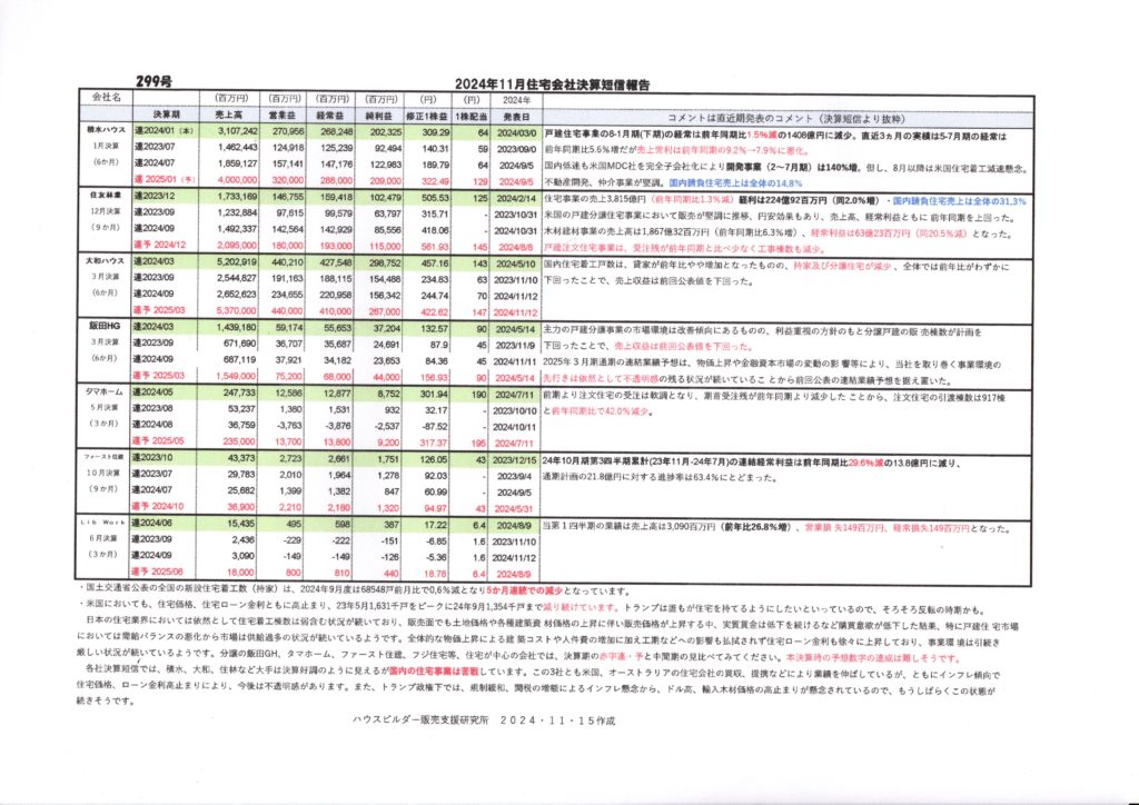 299号・住宅業界中間決算一覧