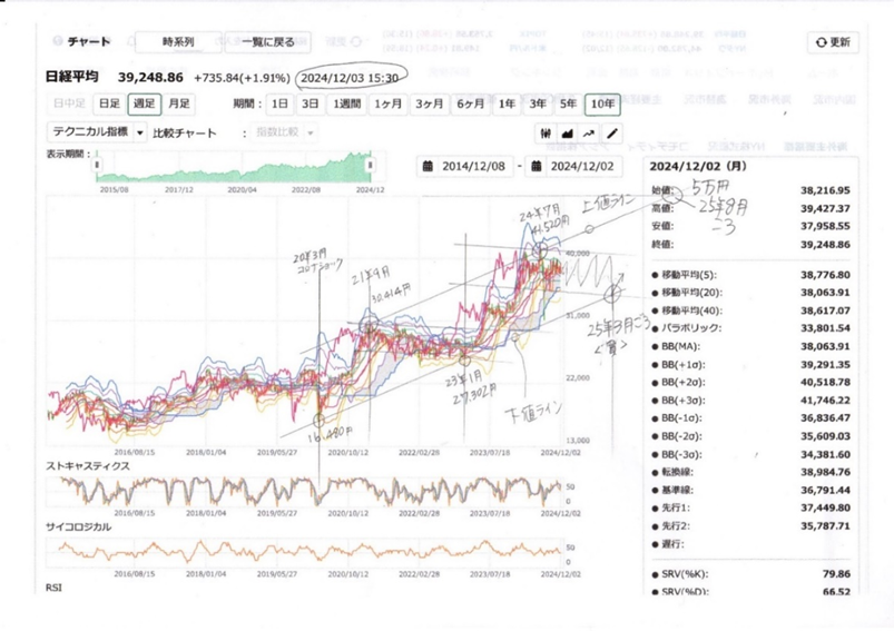 2020年コロナショック時の日経平均16,480円。2倍返しが21年9月の30,414円を付けた後、23年1月27,302円まで下落。24年7月高値42,426円。12月5日現在39,632円。16,480円の3倍返しは49,440円、25年にはあと1万円は上げそう。ただ、こちらも、日本株はNY株に連動しているので注意が必要。