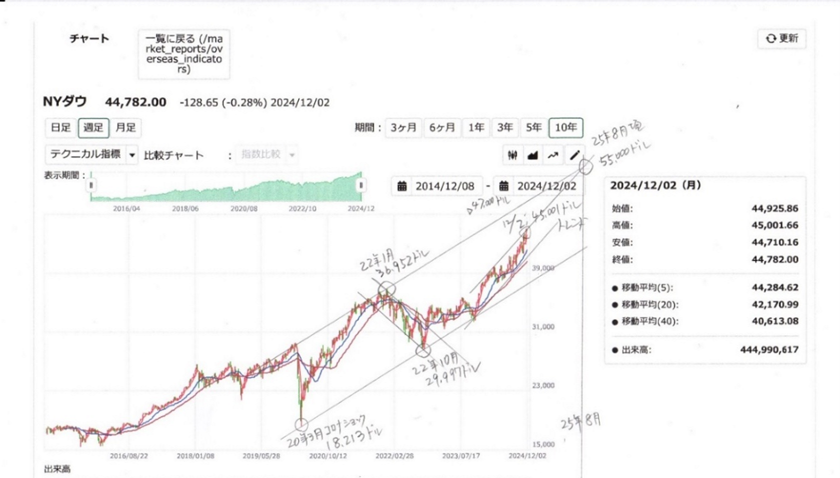 2020年3月コロナショック時のダウ平均18,213ドル。18,213ドルの2倍返しが22年1月の36,952ドルを付けた後、22年10月10日29,997ドルまで下落。その後、24年12月2日現在、2,5倍返しの45,001ドルとなっています。調整安があったとしても、ここまでくると3倍返しが54,639ドル。25年にはあと1万ドルは上げると思います。ただ、これからのNY株買いは、リスクを伴います。なので、シロートは難しいかなと思います。