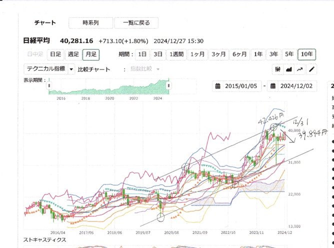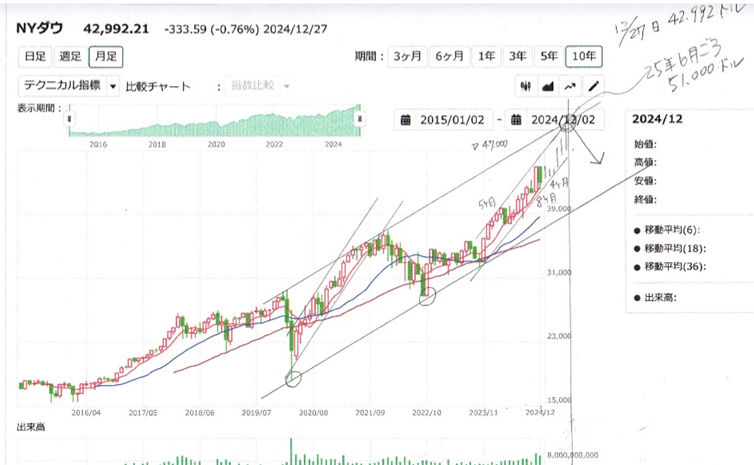 上記は、NYダウ25年2月中に45、073ドルを超えれば6月ごろ51、000ドルで当面の高値。その後はトランプ政権次第ではないでしょうか。ただし、その後の投資が一番利益を生み出す「ハイリスクはハイリターン」でしょうが、いつ下げてもおかしくない状態なので、一般の人は度胸が座っていないとついていけません。